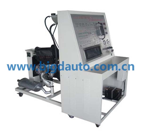 設備采用獨立式設計方法,分:1 發動機拆裝臺(包含原車發動機總成、起動機總成、發電機總成、進氣系統、排氣系統(帶三元催化)、所有傳感器、執行器、發動機拆裝翻轉架等),2發動機控制臺(包含電控單元、發動機防盜系統、組合儀表、點火開關等)。相互獨立分開,互不干擾,能夠獨立完成相關教學課題。把冷卻水道、燃油供給油管、真空表、電路控制航空接頭等設備連接起來后,可實現發動機起動、怠速、加速、減速等工況實訓。
