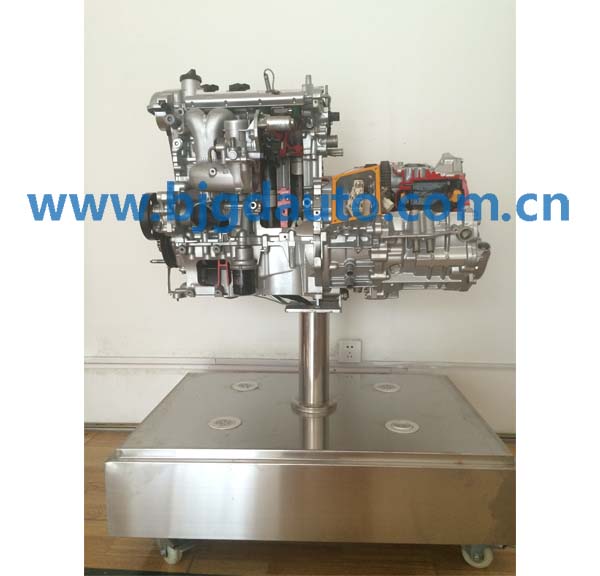 設備采用電控發動機總成實物制作,發動機的關鍵部位加以爆炸式解剖,解剖剖面采用硬拉絲鍍膜工藝、精細分色,內部和外部機件電鍍處理,其他部件鈍化防腐,根據用戶要求采用各種材質、各種形狀的底座。發動機采用減速電機驅動。配置射燈直觀、清晰觀察發動機的組成和機構的運動關系,采用光電程控技術,通過LED燈顯示發動機各缸工作狀態。氣缸、活塞、曲軸連桿、凸輪軸、進氣門、排氣門、氣門頂、火花塞、噴油器、進氣歧管、排氣歧管、發電機、機油泵、水泵、節溫器、噴油嘴、節氣門體等內部結構清晰可見。利用本實驗臺可以使學員輕松、真實地了解發動機機械系統的組成、各部件的外形、各機構彼此之間的連接和運動關系,加深學生對發動機機械系統組成和工作原理的理解,幫助學生理解抽象的控制理論。本實驗臺制作精致,設計合理,安全可靠,教學功能完備,是各類培訓機構講授汽車發動機結構課程的理想教學平臺。