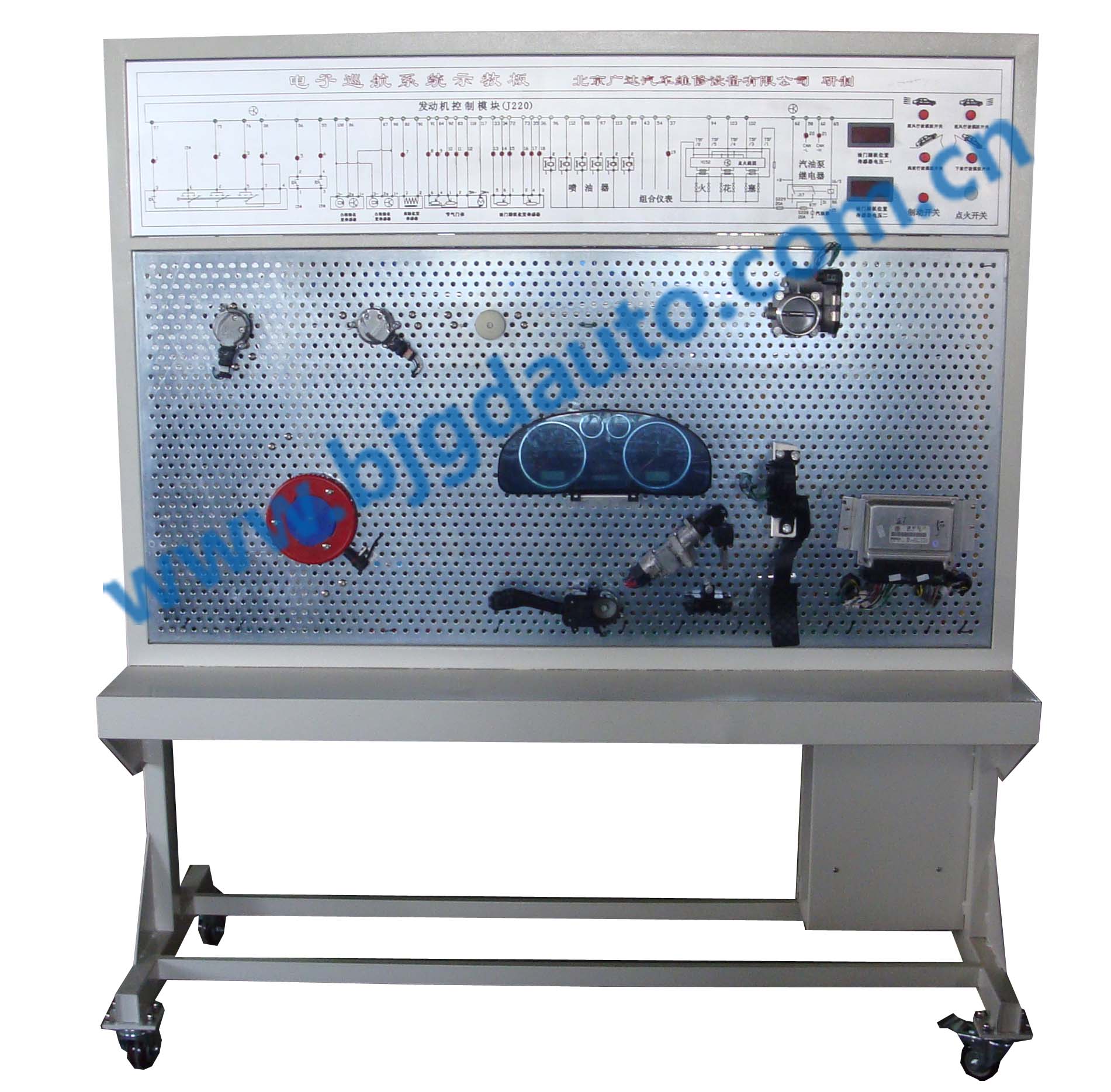 電路原理圖面板制造工藝先進,采用高端鋁塑板噴繪技術加工,不變形,不褪色。學員可直觀對照電路圖和實物,認識和分析該系統的工作原理。面板安裝有4mm外接檢測端子,可直接在面板上檢測各傳感器、執行器、控制單元管腳的參數,如電阻、電壓、電流、頻率信號等。