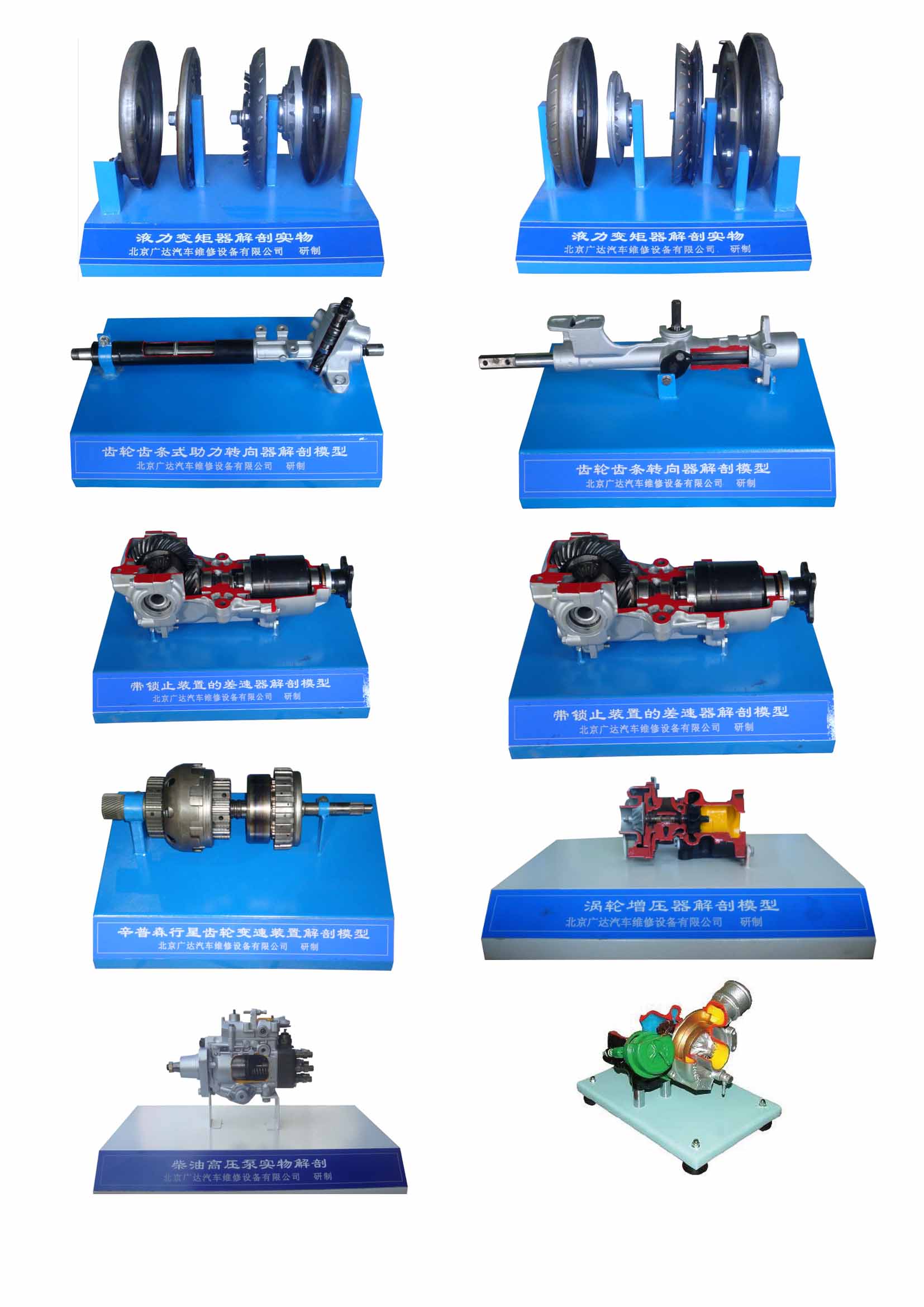 模型以汽車典型零配件實物為基礎,有各種零部件解剖展示臺100多種,對各關鍵部分進行充分剖切,剖面分層刷涂不同的顏色,可以清晰的反映出零部件的內部結構,方便觀察設備的組成和運行方式、理零部件的工作過程,掌握基本原理。解剖后的汽車典型零部件安裝在底座之上,便于擺放和展示。本產品適用于學校專業教室進行理論教學和實訓教學。