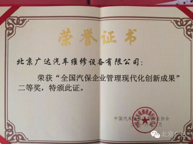 會議期間,還公布了全國汽保企業管理現代化創新成果的評選結果,北京廣達時刻緊跟市場大環境的發展,從內部管理到對外銷售、服務等方面開展了一系列的自我創新轉型,并在此次評選中榮獲二等獎。